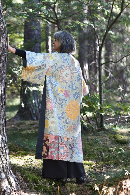 Kimono composé d’une soie rare, créée dans les années 90 par Manuel Canovas, le grand éditeur français de tissus d’ameublement. Des fleurs oniriques et solaires pour un voyage exotique intitulé « Manchuko ».